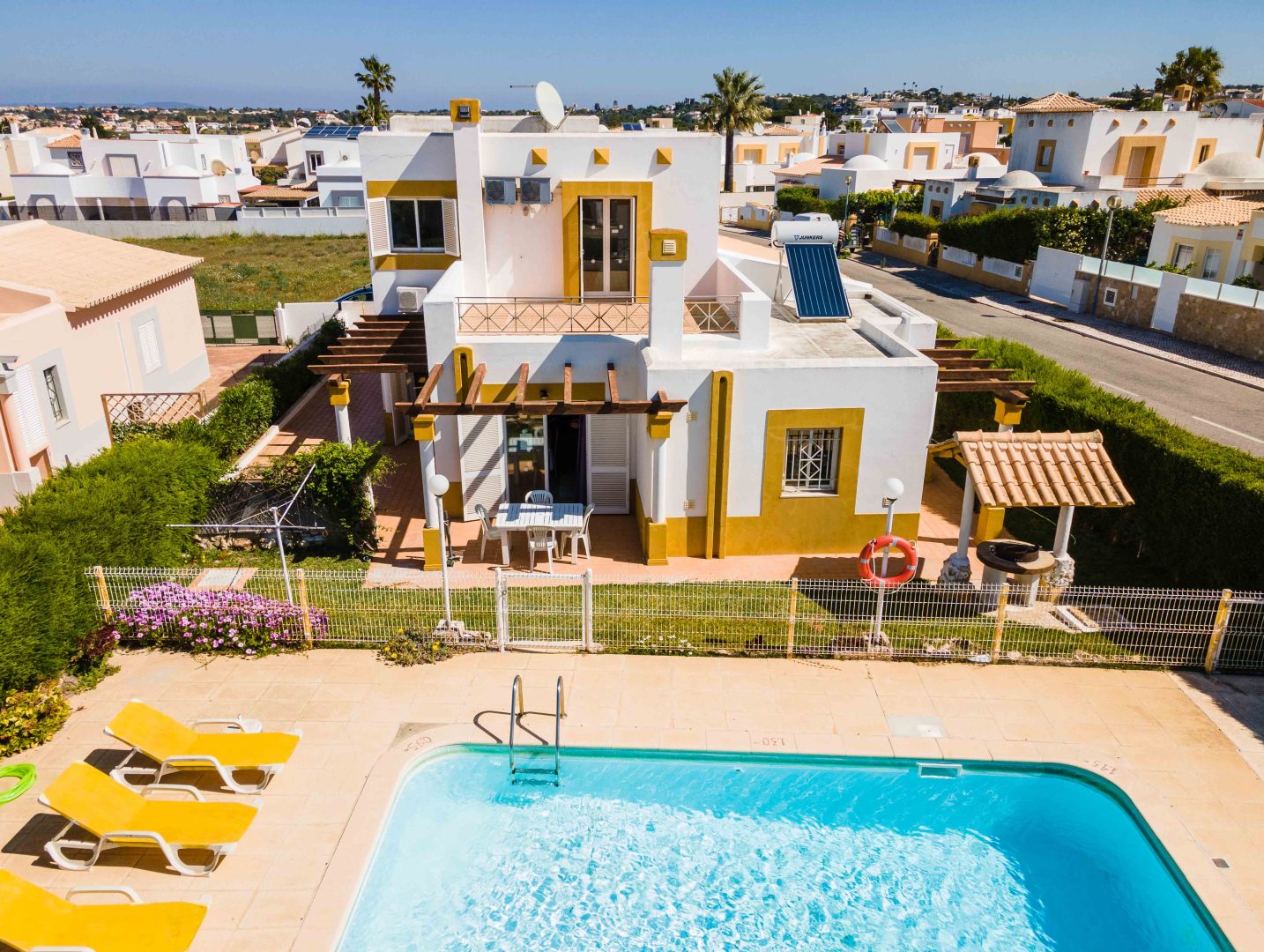 - Comodidades: Aluguer de carro: Essencial, Ar Condicionado, Chaleira, Fogão, Forno, Máquina de Café, Microondas, Piscina, Torradeira, TV, TV por Cabo, TV por Satélite, Wi-Fi